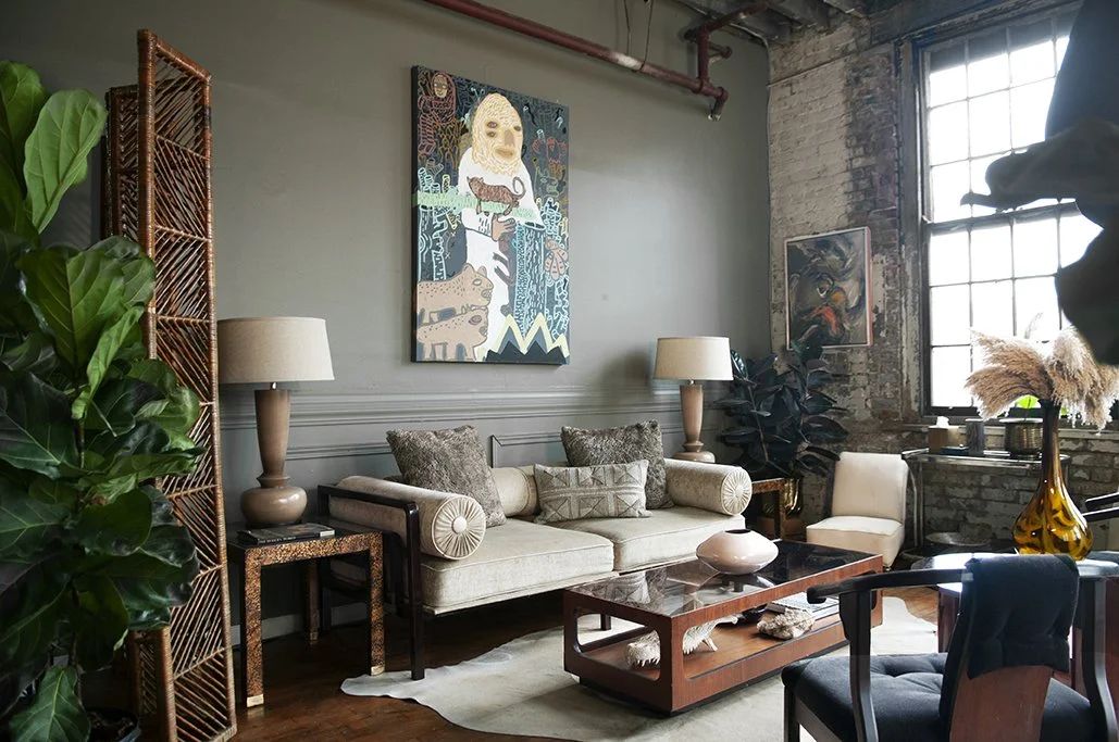 From the bold contours of the sculptural Brown Saltman Sofa to the airy minimalism of the Italian Zermatt Sling Bench, and the unexpected occurrence of old-world tradition found in the Hollywood Regency Silk sofa, the open layout allows each piece to assert its own presence in this loft space. Majestic fig trees serve as natural partitions, while vintage folding screens add structure and definition, creating an environment full of artistic potential.