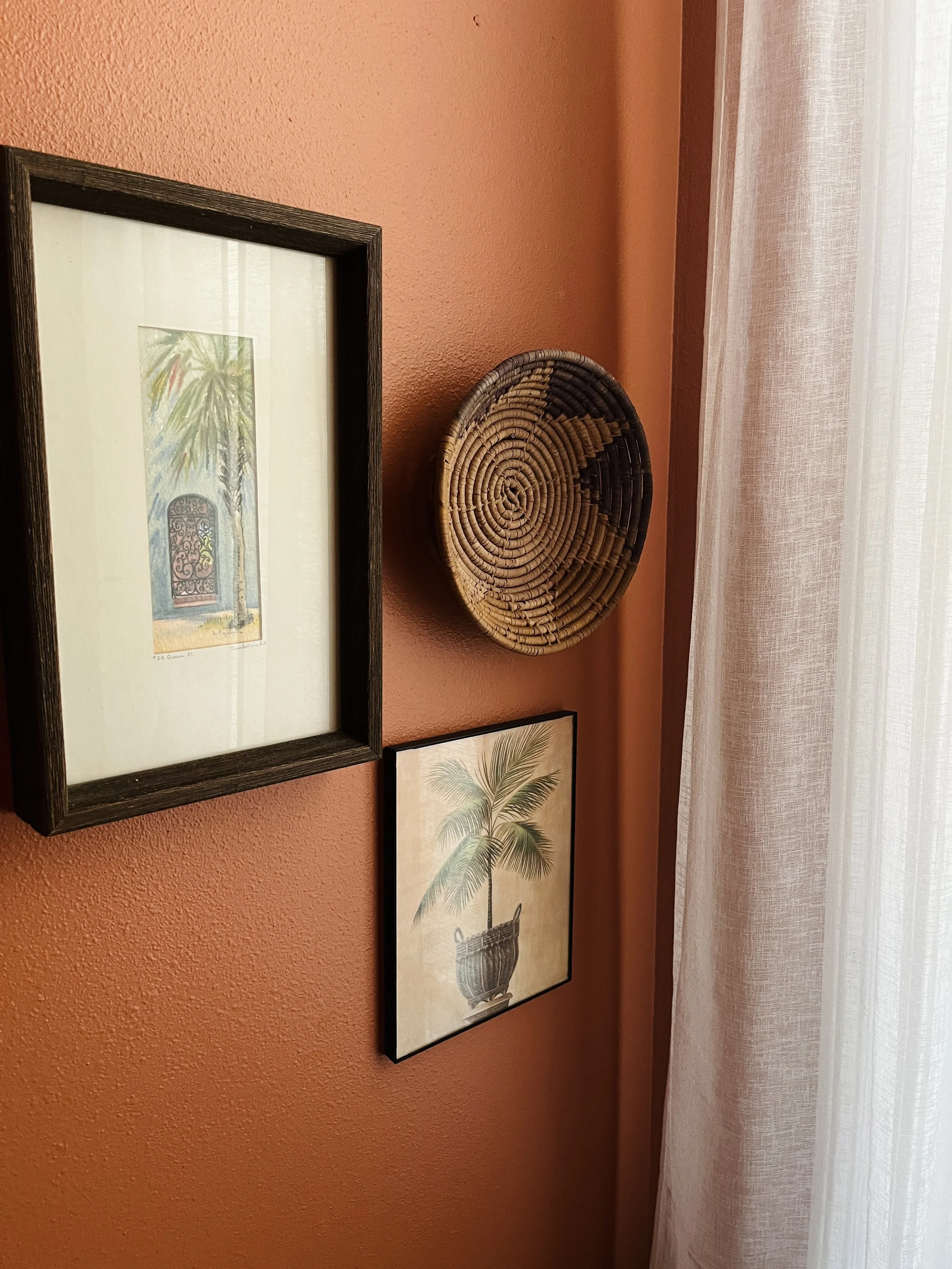 Carrying that same layered approach into the bedroom, mid‑century silhouettes meet Mediterranean warmth: terracotta walls and earthy linens hint at Spanish and Southwestern influences without overpowering the room. A simple wood bed frame and nightstand maintain a clean layout, while woven rattan accents and graphic pillows introduce a subtle nod to 1970s bohemian flair. The sun‑washed palette of natural materials and muted hues creates a seamless flow from the living room’s collected, unexpected mix.